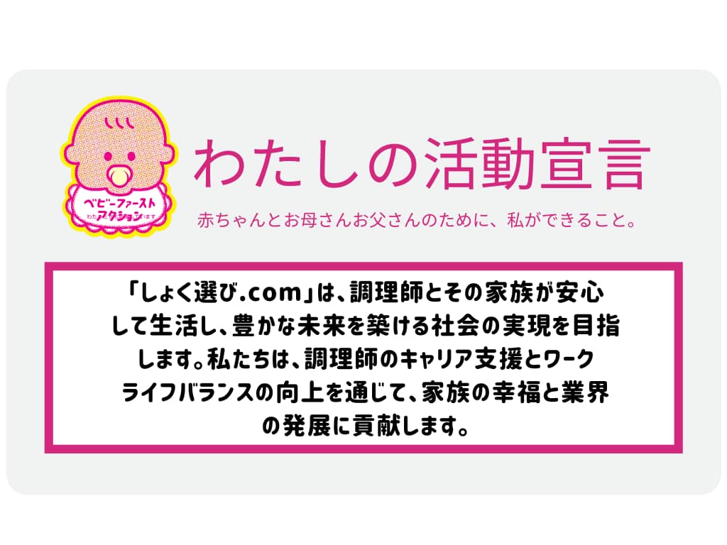 企業・個人 しょく選び.com 2025.09.08 活動宣言 「しょく選び.com」は、調理師とその家族が安心して生活し、豊かな未来を築ける社会の実現を目指します。私たちは、調理師のキャリア支援とワークライフバランスの向上を通じて、家族の幸福と業界の発展に貢献します。 アクションプラン ACTION01 家族を重視した求人情報の提供 ACTION02 育児中の調理師へのキャリアサポート ACTION03 育児支援に積極的な企業との連携 企業HPへ Post Share Hatena LINE RSS feedly Pin it note