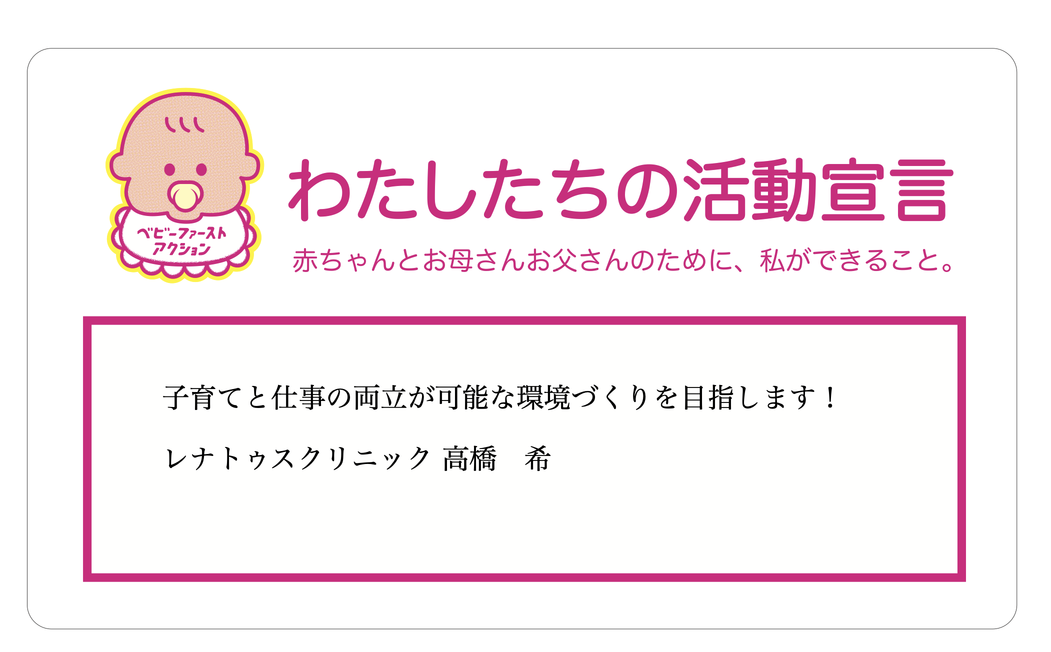 が安心して子育てできる環境を整えることが、社会全体の豊かさに つながると信じています。そこで、子育て中の親を支援し、赤ちゃ んを中心に考えたサポート体制を整えるため、以下の取り組みを推 進することを宣言いたします。