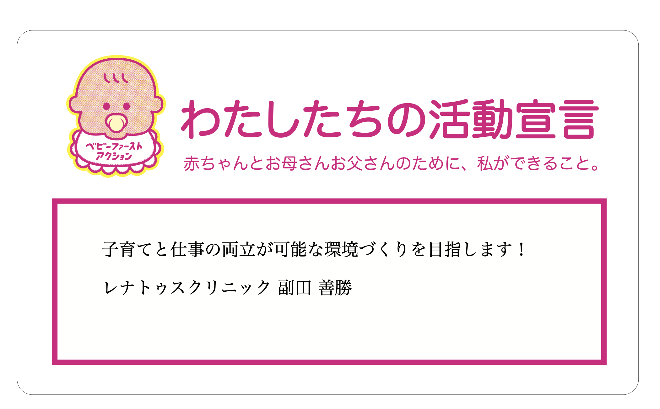 が安心して子育てできる環境を整えることが、社会全体の豊かさに つながると信じています。そこで、子育て中の親を支援し、赤ちゃ んを中心に考えたサポート体制を整えるため、以下の取り組みを推 進することを宣言いたします。