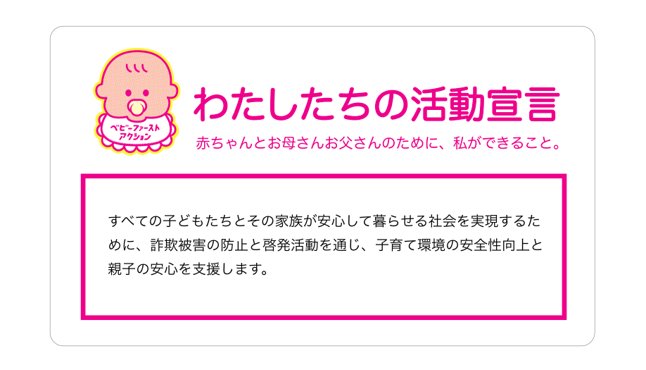 すべての子どもたちとその家族が安心して暮らせる社会を実現するために、詐欺被害の防止と啓発活動を通じ、子育て環境の安全性向上と親子の安心を支援します。