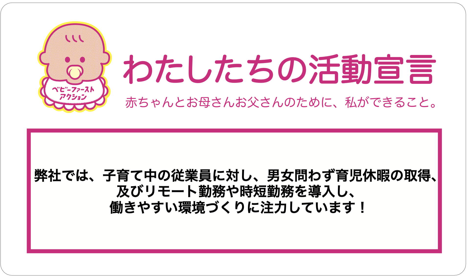 企業・個人 株式会社物販総合研究所 2025.08.21 活動宣言 弊社では、子育て中の従業員に対し、男女問わず育児休暇の取得、及びリモート勤務や時短勤務を導入し、働きやすい環境づくりに注力しています! アクションプラン ACTION01 リモート勤務、及び時短勤務の導入 企業HPへ Post Share Hatena LINE RSS feedly Pin it note