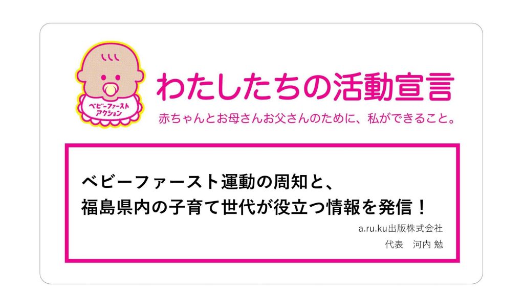企業・個人 a.ru.ku出版株式会社 2022.12.31 2024.03.08 活動宣言 ベビーファースト運動の周知と、福島県内の子育て世代が役立つ情報を発信! 代表取締役 河内 勉 アクションプラン ACTION01 自社メディア(フリーマガジン、webサイト、SNS)での啓蒙活動 企業HPへ Post Share Hatena LINE RSS feedly Pin it note