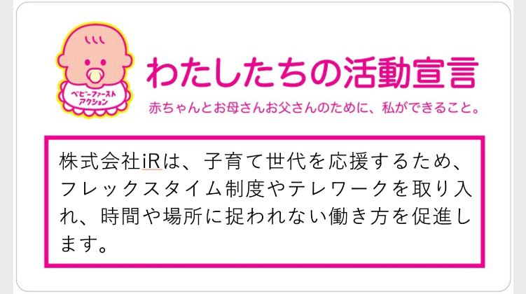 株式会社iRは、子育て世代を応援するため、フレックスタイム制度やテレワークを取り入れ、時間や場所に捉われない働き方を促進します。