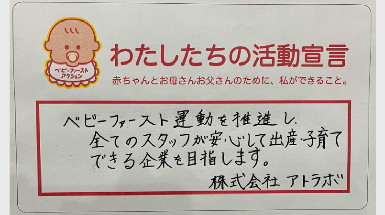 ベビーファースト運動を推進し全てのスタッフが安心して出産・子育てできる企業を目指します。