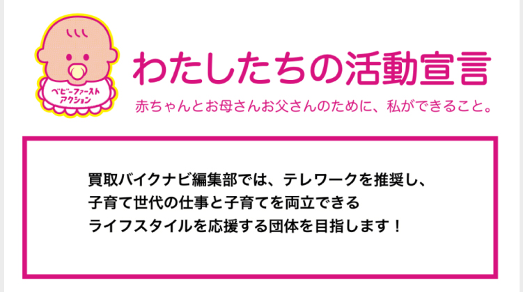 企業・個人 買取バイクナビ 2024.05.13 2024.06.21 活動宣言 買取バイクナビ編集部では、テレワークを推進し、子育て世代の、仕事と子育てを両立できるライフスタイルを応援する団体を目指します。 土井健生 アクションプラン ACTION01 1.リモートワークやフレックスなど社内制度を整備し、安心して子育てできる環境作りを推進 ACTION02 2.ウェブメディアでベビーファースト運動を紹介 ACTION03 3.子育て世代の働く機会創出 企業HPへ Post Share Hatena LINE RSS feedly Pin it note