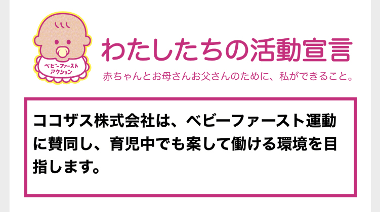 ココザス株式会社は、ベビーファースト運動に賛同し、育児中でも案して働ける環境を目指します。