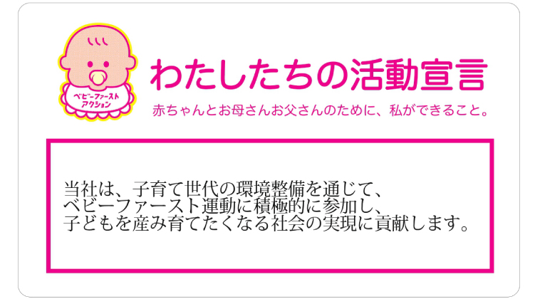私たちは、ベビーファースト運動に参加し、子どもを産み育てたくなる社会の実現に貢献します。子育て世代が安心して子育てを行える環境を築くことを使命とし、企業としての社会的責任を全うします。