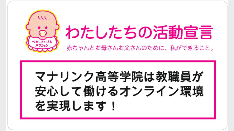 在宅勤務を導入しているため育児と両立しながら教員の仕事ができる環境や育児から仕事復帰のしやすい環境の実現マナリンク高等学院は、子育てしやすい社会の実現に向けて積極的に貢献してまいります。オンライン教育の可能性を最大限に活用し、時間や場所の制約を超えて、すべての人が学びと子育てを両立できる環境づくりを目指します。