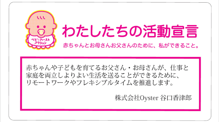 企業・個人 株式会社Oyster 2024.07.22 2024.09.02 活動宣言 赤ちゃんや子どもを育てるお父さん・お母さんが、仕事と家庭を両立しよりよい生活を送ることができるために、リモートワークやフレキシブルタイムを推進します。 谷口香津郎 アクションプラン ACTION01 1)リモートワークの推進 ACTION02 2)フレキシブルタイムの推進 ACTION02 3)独自の育児休暇制度検討 企業HPへ Post Share Hatena LINE RSS feedly Pin it note
