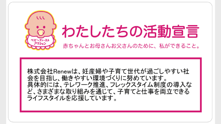 株式会社Renewは、妊産婦や子育て世代が過ごしやすい社会を目指し、働きやすい環境づくりに努めています。具体的には、テレワーク推進、フレックスタイム制度の導入など、さまざまな取り組みを通じて、子育てと仕事を両立できるライフスタイルを応援しています。