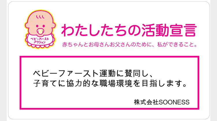 企業・個人 株式会社SOONESS 2024.09.30 2024.11.13 活動宣言 ベビーファースト運動に賛同し、子育てに協力的な職場環境を目指します。株式会社SOONESS 金城宇伸 アクションプラン ACTION01 テレワーク等を取り入れ赤ちゃんと家族の時間を確保できるように取り組む 企業HPへ 海外FX株式会社 前の記事 アンドバルーン 次の記事 関連記事 2025.11.24 株式会社クイックマン 2025.11.24 2025.11.24 株式会社アックスコンサルティング 2025.11.24 2025.11.24 GrowthPartners税理士法人 2025.11.24