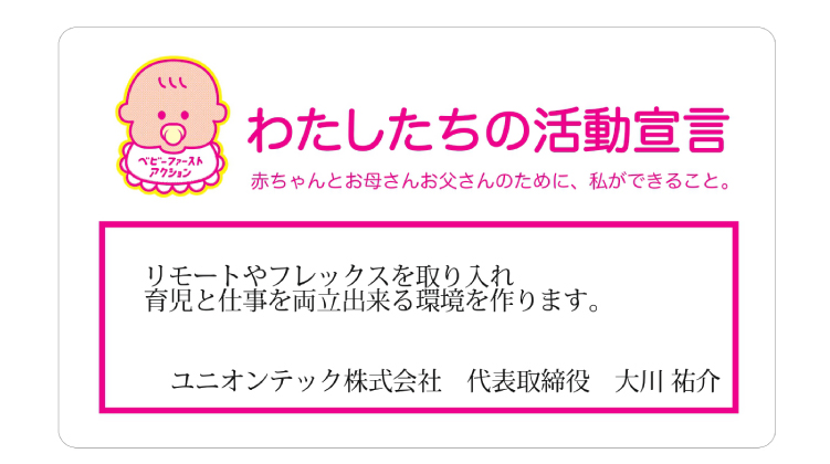 企業・個人 ユニオンテック株式会社 2023.08.28 2024.03.08 活動宣言 リモートやフレックスを取り入れ、育児と仕事を両立出来る環境を作ります。 石井 慎 アクションプラン ACTION01 1.フレックス制度による、柔軟な働き方の実現 ACTION02 2.子育て世代が働きやすい職場環境づくりに取組みます。 ACTION03 3.リモートワーク・時短業務の実施を推進 企業HPへ Post Share Hatena LINE RSS feedly Pin it note
